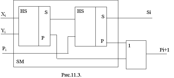Комбинационный сумматор можно реализовать также с использованием двух полусумматоров и логического элемента ИЛИ, как показано на рис.11.3.