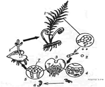 Задание 35 № 11009. Какими цифрами обозначены на рисунке «Цикл развития папоротника» гаплоидные стадии развития? Назовите их.
