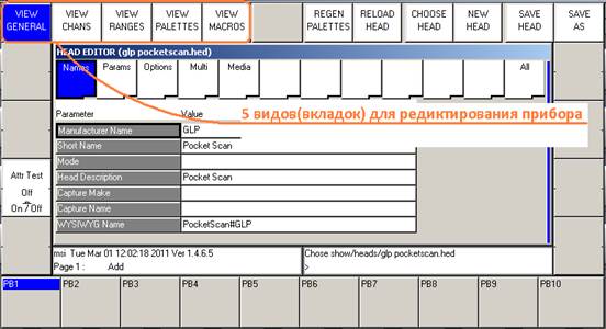 В HEAD EDITOR-е есть 5 глобальных вкладок для редактирования прибора