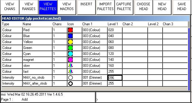 Следующая вкладка VIEW PALLETES дает возможность создать палитры по умолчанию для создаваемых приборов, тут все понятно, выбираем цвет и уровень канала(level 1) на котором этот цвет генерируется прибором. Если цветовых каналов много, то, соответственно, вбиваем значения для каждого канала.