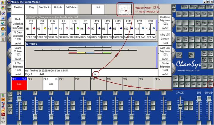 Теперь давай посмотрим, как можно менять интенсивности приборов вручную. Открой окошко INTENSITY правой глобальной кнопкой int. Пошевелив некоторыми ползунками, ты увидишь, что они все покраснели, это значит что их значения были внесены в программатор. Можно так же менять значения интенсивностей с помощью команд: