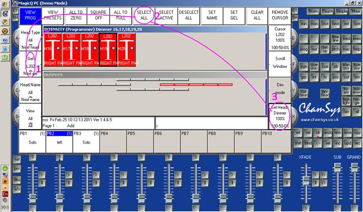 Когда активно окно INTENSITY, слева вверху есть 2 вида VIEW PROG и VIEW PRESETS, первый вид вносит изменения только в программатор для последующей записи значений, второй вид дает возможность регулировать интенсивности диммеров на лету, сразу передавая значения реальным приборам и не записывая их в программер. Продолжим работать в окне INTENSITY с видом VIEW PROG.