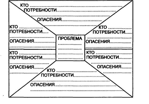 Потребности. Мы пользуемся этим термином в его широком смысле — он может означать желания, ценности, интересы и вообще все, что может казаться важным для человека. Вы можете просто спросить участников: «В отношении к проблеме... в чем заключаются Ваши/их главные потребности?». Вы можете задать этот вопрос себе,