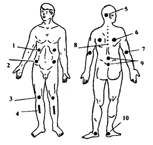 1-край рёберной дуги; 2-верхняя передняя ость подвздошной кости; 3- надколенник; 4- передняя поверхность большеберцовой кости; 5- наружный затылочный выступ; 6- лопатка; 7- локтевой отросток; 8- остистый отросток; 9- крестец и копчик; 10- бугор пяточной кости.