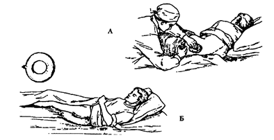 Для профилактики образования пролежней необходимо каждые 1-2 часа менять, положение больного в постели, ежедневно встряхивать простынь и расправлять ее для ликвидации складок, а по мере необходимости менять. В тех случаях, когда поворачивать больного нельзя, под него необходимо положить резиновый круг, предварительно положенный в наволочку. Круг следует располагать таким образом, чтобы крестец больного находился под его отверстием (рис.)