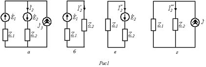 Принимая источники в цепи на рис. 1,а идеальными и учитывая, что у идеального источника ЭДС внутреннее сопротивление равно нулю, а у идеального источника тока – бесконечности, в соответствии с методом наложения приходим к расчетным схемам на рис. 1,б…1,г.