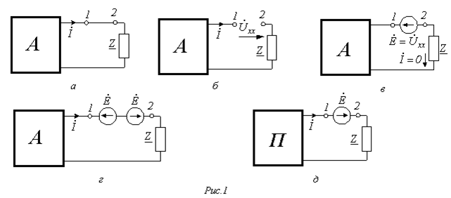 Пусть в схеме выделена некоторая ветвь с сопротивлением Z, а вся оставшаяся цепь обозначена как активный двухполюсник А (рис. 1,а). Разомкнем эту ветвь между точками 1 и 2 (рис. 1,б). На зажимах этой ветви имеет место напряжение