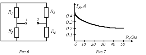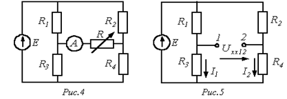 В качестве примера использования метода эквивалентного генератора для анализа определим зависимость показаний амперметра в схеме на рис. 4 при изменении сопротивления R переменного резистора в диагонали моста в пределах