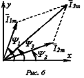этого тока путем соответствующих тригонометрических преобразований получается довольно громоздким и мало наглядным, особенно, если суммируется большое число синусоидальных величин. Значительно проще это осуществляется с помощью векторной диаграммы. На рис. 6 изображены начальные положения векторов токов, проекции которых на ось ординат дают мгновенные значения токов для t=0. При вращении этих векторов с одинаковой угловой скоростью w их взаимное расположение не меняется, и угол сдвига фаз между ними остается равным