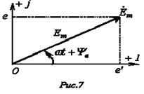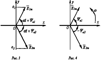 На декартовой плоскости из начала координат проводят векторы, равные по модулю амплитудным значениям синусоидальных величин, и вращают эти векторы против часовой стрелки (в ТОЭ данное направление принято за положительное) с угловой частотой, равной w. Фазовый угол при вращении отсчитывается от положительной полуоси абсцисс. Проекции вращающихся векторов на ось ординат равны мгновенным значениям ЭДС е1 и е2 (рис. 3). Совокупность векторов, изображающих синусоидально изменяющиеся ЭДС, напряжения и токи, называют векторными диаграммами. При построении векторных диаграмм векторы удобно располагать для начального момента времени (t=0), что вытекает из равенства угловых частот синусоидальных величин и эквивалентно тому, что система декартовых координат сама вращается против часовой стрелки со скоростью w. Таким образом, в этой системе координат векторы неподвижны (рис. 4). Векторные диаграммы нашли широкое применение при анализе цепей синусоидального тока. Их применение делает расчет цепи более наглядным и простым. Это упрощение заключается в том, что сложение и вычитание мгновенных значений величин можно заменить сложением и вычитанием соответствующих