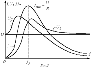 Резонансными кривыми называются зависимости тока и напряжения от частоты. В качестве их примера на рис. 3 приведены типовые кривые I(f);