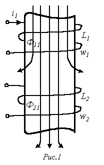 На рис. 1 схематично показана картина магнитного поля при наличии тока i1 в первой катушке (направление силовых линий магнитного потока определяется по правилу правого буравчика). Витки первой катушки сцеплены с магнитным потоком самоиндукции Ф11, а витки второй катушки – с магнитным потоком взаимной индукции Ф21, который отличается от Ф11 (Ф21< Ф11) за счет потоков рассеяния.