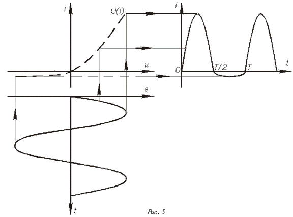 К полученному результату необходимо сделать следующий комментарий. Использование при анализе подобных цепей ВАХ идеального вентиля (обратный ток отсутствует, в проводящем направлении падение напряжения на диоде равно нулю) корректно при достаточно больших значениях амплитуд приложенного к диоду напряжения, определяющих значительное превышение током, протекающим через вентиль в прямом направлении, его обратного тока, вследствие чего последним можно пренебречь. При снижении величин напряжения, когда эти токи становятся сопоставимыми по величине, следует использовать ВАХ реального диода,представленную на рис. 4 и учитывающую наличие обратного тока.