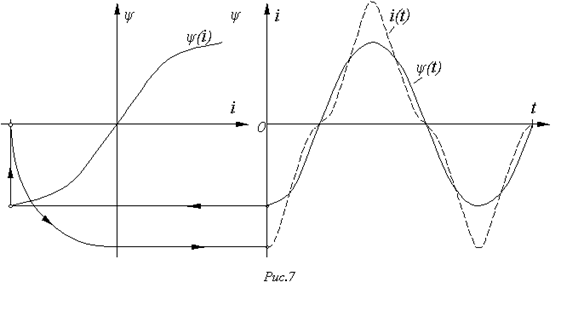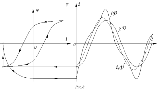 на катушке синусоидально, а протекающий через нее ток имеет явно выраженную несинусоидальную форму. Аналогично можно показать, что при синусоидальном токе поток, сцепленный с катушкой, и напряжение на ней несинусоидальны.