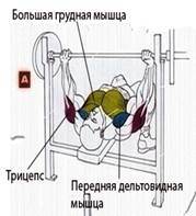 1. Жим штанги лежа. И.П. -Лечь спиной на горизонтальную скамью.