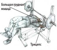 2. Жим штанги лежа на скамье с обратным наклоном. И.П. -Лежа головой вниз на скамейке с уклоном 20-40 градусов.