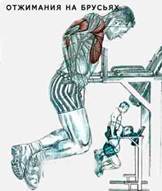 4. Отжимания на брусьях. И.П. -Опереться на рукояти параллельных брусьев прямыми руками.