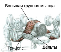 1. Жим штанги лежа 3х10-12р. | 2. Жим штанги лежа на скамье с обратным наклоном 4х6-15р. | 3. Отжимания от пола 3х8-10 р. | 4. Отжимания на брусьях 4 х8-15р. |