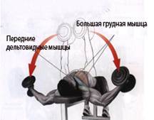 6. Разводка с гантелями. И.П. -Лежа спиной на узкой скамье, позволяющей свободно двигать плечами.
