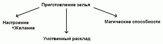 | Основные способы приготовления зелий. 1. Смешивание компонентов (необходимо скрепить их заклинанием). 2. Настаивание. 3. Перегонка. 4. Варка (является самым классическим и самым продуктивным способом приготовления зелий). |