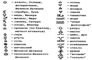 | Алхимический символ – это условное обозначения элемента (вещества), отражающее его состав, свойства и ряд признаков, касающихся космоса. |