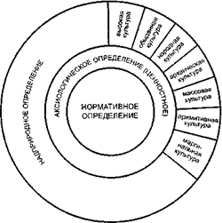 Среди тех определений, которые главным принципом своего рассмотрения делают результаты человеческой деятельности, есть несколько вариантов — от предельно широкого до наиболее узкого. Подчеркнем еще раз, что эта система определений в качестве культуры рассматривает только результаты человеческой деятельности. Среди них мы выделим надприродное, аксиологическое (ценностное) и нормативное определения культуры (см. схему 1).