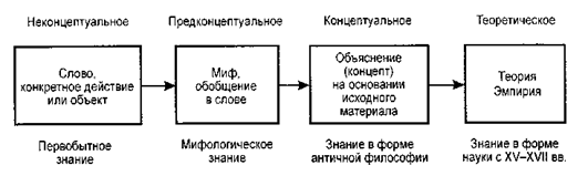 В процессе своего развития наука выработала различные методы научного познания, такие, как наблюдение и эксперимент, моделирование, идеализацию, формализацию и другие. За многие века своего существования она прошла сложный путь от неконцептуального знания до становления теории (см. схему 5). Наука оказывает воздействие на интеллектуальную культуру общества, развивая и углубляя логическое мышление, предлагая специфический путь поиска и построения аргументации, способов и форм постижения истины. В той или иной форме наука накладывает отпечаток на моральные нормы и всю систему нравственности общества, на искусство и даже, в определенной мере, на религию, которой время от времени приходится приводить свои основные принципы в соответствие с неопровержимыми научными данными. (Например, уже в конце XX века официальная католическая Церковь все больше отходит от идеи сотворения человека. Она признает сотворение мира, полагая, что дальнейшее его развитие представляет собой естественный процесс).