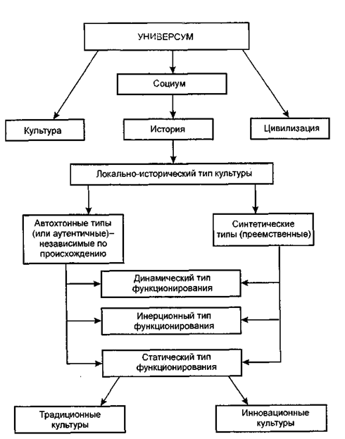 Однако следует иметь в виду, что существуют и другие способы рассмотрения конкретных культур. Одни ученые выделяют локально-исторические типы культуры (культура древнего Египта, культура греческой античности, культура древнего Рима и другие). В. И. Ожогин применяет иную типологию, вычленяя культуры автохтонные (греч. autos “сам” + chthon “земля”), возникшие на месте их современной дислокации и независимые в своем происхождении от каких-либо внешних факторов, как, например, египетская культура, и синтетические (основанные на синтезе: греч. synthesis “соединение, сочетание”), преемственные, как культура древнего Рима, явно воспринявшая культурную эстафету от этрусков и соединившая в себе культурные основания умбров, сабинов, латинян и других племен. По способу функционирования относительно внешних для данной культуры факторов он подразделяет культуру на динамический тип (имеющий внутренний потенциал для развития и воздействия на другие культуры) и статический, инерционный тип. Если в динамическом типе функционирования культуры преобладают инновации, то статический тип базируется на традиции (см. схему 6).