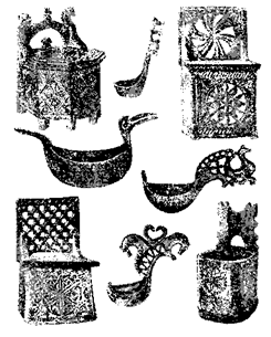 Высокого уровня достигли ремесла, особенно кузнечное. “Русские кузнецы производили самые разнообразные предметы из металла. Железные лопаты и оковки для деревянных лопат, лемеха, серпы, косы, топоры, гвозди, ножницы, рыболовные крючки, наконечники, копья, ножи, долота, сковороды, цепи, удила, остроги выковывались кузнецами” [210, с. 9]. Изделия русских оружейников рано стали известны за пределами Руси как на Востоке, так и на Западе. Мечи и боевые топорики, кольчуги и шлемы, щиты воспевались и в древнейших преданиях, и в летописях. До нас дошли также изделия древних ювелиров, знакомых с самыми утонченными способами и техниками изготовления украшений. В X—XII веках выполняли золотые и серебряные изделия, используя технику скани (скручивания металлической проволоки), зерни (изготовления вещей из мельчайших зерен, которые припаивались к основанию по особому рисунку), эмали. Украшения, утварь для религиозных обрядов, предметы роскоши для княжеских палат — все говорит о высоком