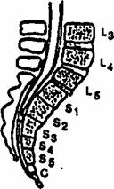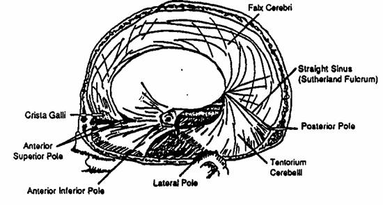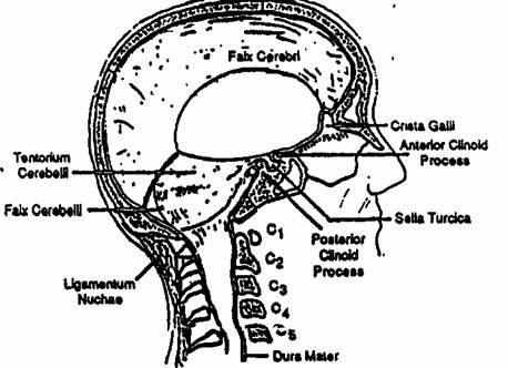 Рис. 53. Сагитальный срез, показывающий переходы друг в друга серпа большого мозга, намета мозжечка, серпа мозжечка и спинальной части твердой мозговой оболочки.