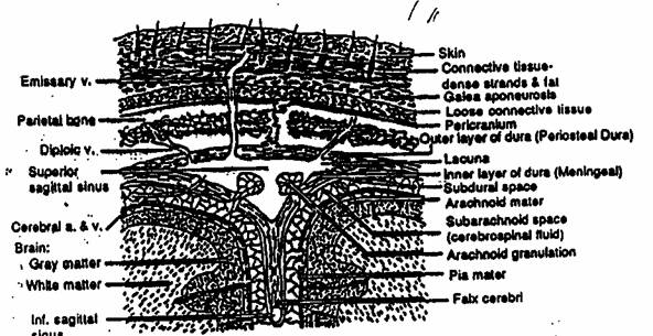Рис. 54. Схема среза через скальп. Череп, мозговые оболочки и