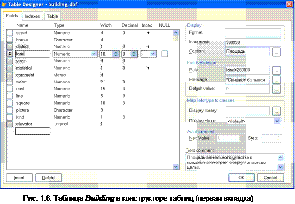 Первая вкладка (рис. 1.6) используется при определении полей таблицы. Она предназначена для ввода названия полей, типа данных и ширины поля. При занесении числовых полей задается количество десятичных знаков. Кроме основных параметров для каждого поля на этой вкладке задаются дополнительные параметры, которые помогут вам при сопровождении программного комплекса. Обратите особое внимание на ячейку Field comment. Не оставляйте ее пустой! Опишите подробно назначение поля таблицы. Позже обязательно поймете важность этого совета.