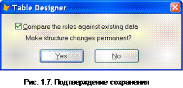 5. Повторите шаги 1-4 для всех оставшихся полей таблицы. Остальные поля первой вкладки конструктора таблиц на этом этапе можно не заполнять. После занесения данных обо всех полях таблицы просто закройте окно конструктора таблиц. Появится диалоговое окно «Сохранение», запрашивающее подтверждение на сохранение структуры таблицы (рис. 1.7).