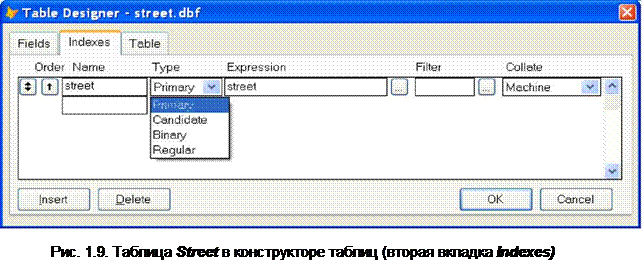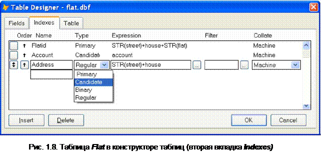 Посмотрим на конечный результат (рис. 1.8). На нем представлены индексы таблицы Flat. Их три: Flat Id (Primary), Account (Candidate) и Address (Regular).