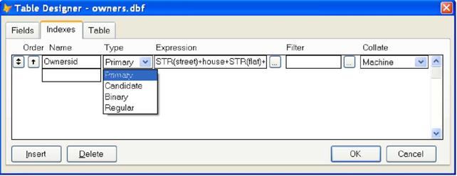Создание обычного индекса по полю таблицы. Порядок создания как простого индекса (Regular), так и уникального (индекса-кандидата Candidate) - один и тот же и практически ничем не отличается от создания первичного ключа. Просто в пункте номер пять предыдущей инструкции выберите соответствующее значение (Regular или Candidate). Все индексы одной таблицы Visual FoxPro хранит в одном CDX-файле.