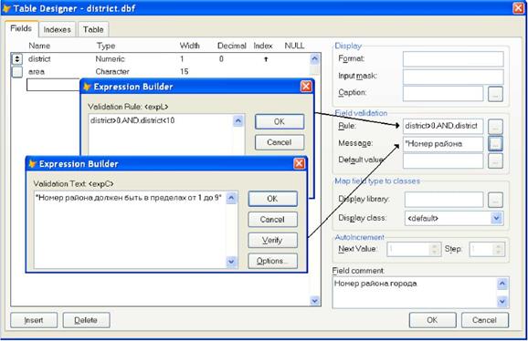 Запустите построитель выражений для ячейки Message, выбрав пиктограмму Q. Наберите на клавиатуре: «Номер района должен быть от 1 до 9» и щелкните по кнопке OK. Закройте окно конструктора таблицы и подтвердите сохранение сделанных изменений.