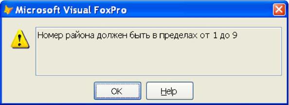 При попытке ввода номера района, который не находится в пределах диапазона 1-9, получим сообщение об ошибке и отказ программного комплекса от записи в таблицу сделанных изменений (рис. 1.15).