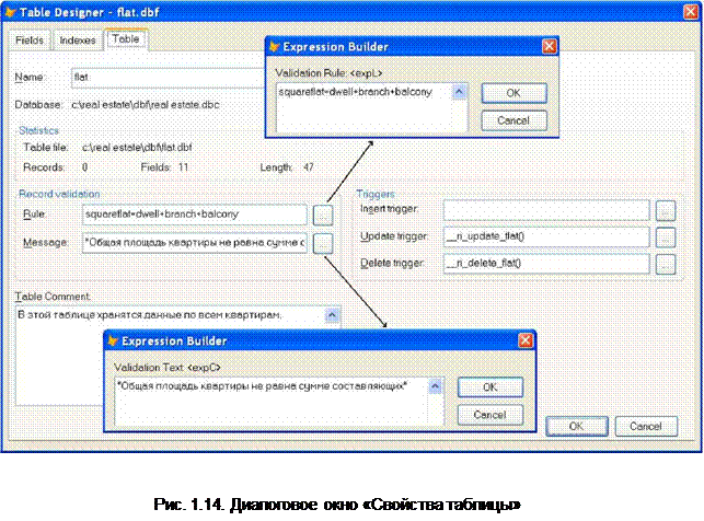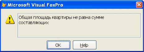 Запустите построитель выражений для ячейки Message, выбрав пиктограмму О. Наберите на клавиатуре: "Общая площадь квартиры не равна сумме составляющих" и щелкните по кнопке OK. Закройте окно конструктора таблицы и подтвердите сохранение сделанных изменений.