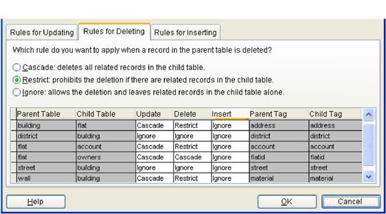 В нижней части конструктора перечислены все связи между таблицами (каждая на отдельной строке). В первых двух столбцах приводятся названия родительской и дочерней таблиц. В следующих трех - Update (Обновить), Delete (Удалить) и Insert (Вставить) - указаны правила соблюдения целостности. В начале работы все эти три столбца содержат элемент Ignore (Игнорировать). Однако вы можете сами определить правила поведения для каждой связи и выполняемого действия. Наконец, в последних двух столбцах определены родительский и дочерний индексы, участвующие в отношении.