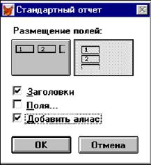 Отмените оба контрольных индикатора Заголовки и Добавить алиас. Отметьте крестиком опцию Поля..., чтобы выбрать поля для отчета.