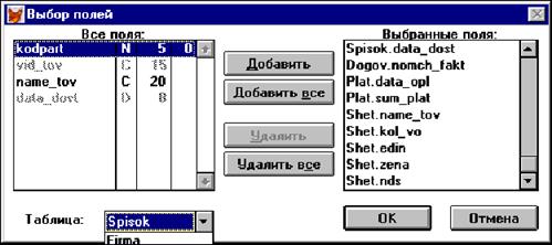 В диалоговом окне Выбор полей приведен список всех полей открытой базы данных (рис. 2.4). Если в различных рабочих областях открыто параллельно несколько баз данных, как в нашем случае, то из комбинированного списка Таблица нужно выбрать по очереди все базы данных, добавляя из каждой базы данных нужные поля. В отчете могут использоваться не все поля базы данных, а только некоторые из них.