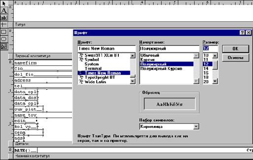 Чтобы изменить тип шрифта, размер символов и т.д., необходимо выделить все поля участвующие в отчете и выбрать команду Объектñ Шрифт. FoxPro откроет диалоговое окно Шрифт (рис. 2.5).