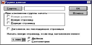 Новую группу можно начать с новой колонки (Новую к олонку)или с новой страницы (Н овую страницу). Если ни одна из опций в этой области не установлена, то записи одной группы будут замыкаться нижним колонтитулом группы, а записи следующей группы будут начинаться в следующей строке заголовком группы.