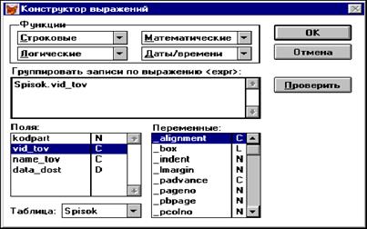 Посредством командной кнопки Группа... вызовите Редактор Выражений. Задайте в нем ключ, по которому должны быть сгруппированы данные (рис. 2.11). Так как к одной группе должны причисляться записи, относящиеся к одной категории товара, то в качестве группировочного ключа рекомендуется использовать поле Vid_tov (категория товара).