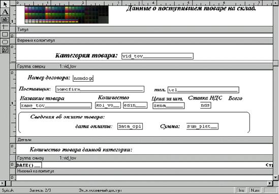 Записи в готовом отчете будут сгруппированы по категории товара. В окно проектирования отчета введены две новые области Группа сверху и Группа снизу (рис. 2.12). Поле Vid_tov, включая относящуюся к нему надпись, нужно перенести в область группа сверху (заголовок группы).
