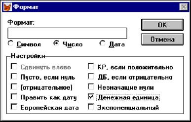 Поле нетто-цены должно содержать денежную величину, и ее следует сформатировать соответствующим образом. Щелкнув мышью на командной кнопке Формат..., активизируется диалоговое окно Формат (рис. 7.17). Нужно выбрать опцию Число и установить контрольный индикатор опции Денежная единица. Затем нажать командную кнопку ОК. Нетто-цена будет выводиться как денежная величина.