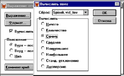 В диалоговом окне Выражение отчета, выбираем опцию Вычислить.... FoxPro открывает диалоговое окно для итоговых вычислений Вычислить поле (рис. 2.20), где выбираем функцию Сумма и указываем интервал вычисляемых значений – Сброс: Spisok.vid_tov.