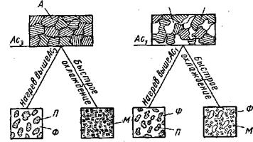 При нагреве доэвтектоидной стали до температур выше точки Асг и последующем охлаждении с той же скоростью в структуре стали наряду с мартенситом будет присутствовать часть феррита и закалка будет неполной. Наличие в закаленной стали феррита будет снижать ее твердость, поэтому такая закалка недопустима.