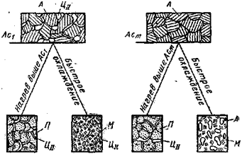 Нагрев заэвтектоидной стали до температуры выше точек Ас3 при охлаждении с той же скоростью приведет к образованию структуры, состоящей из крупнокристаллического мартенсита и значительного количества остаточного аустенита. Такая структура будет обладать более низкой твердостью из-за растворения избыточного цементита и присутствия остаточного аустенита. Кроме того, нагрев стали выше критической точки Асm опасен, т.к. способствует увеличению зерна, возникновению больших закалочных напряжений и обезуглероживанию.