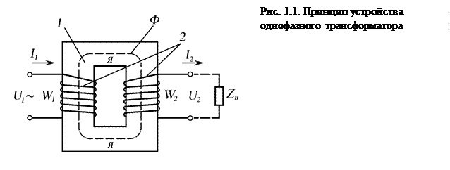 Основными частями трансформатора являются закрытый сердечник из ферромагнитного материала 1 и обмотки 2 (рис. 1.1). Те части сердечника, на которые наложены обмотки, называются стержнями (с)сердечника. Часть сердечника, служащая для замыкания магнитной цепи и не несущая на себе обмоток, называется ярмом (я).У трансформатора имеется два ярма - верхнее и нижнее. Сердечник предназначен для увеличения магнитной связи междуобмотками.